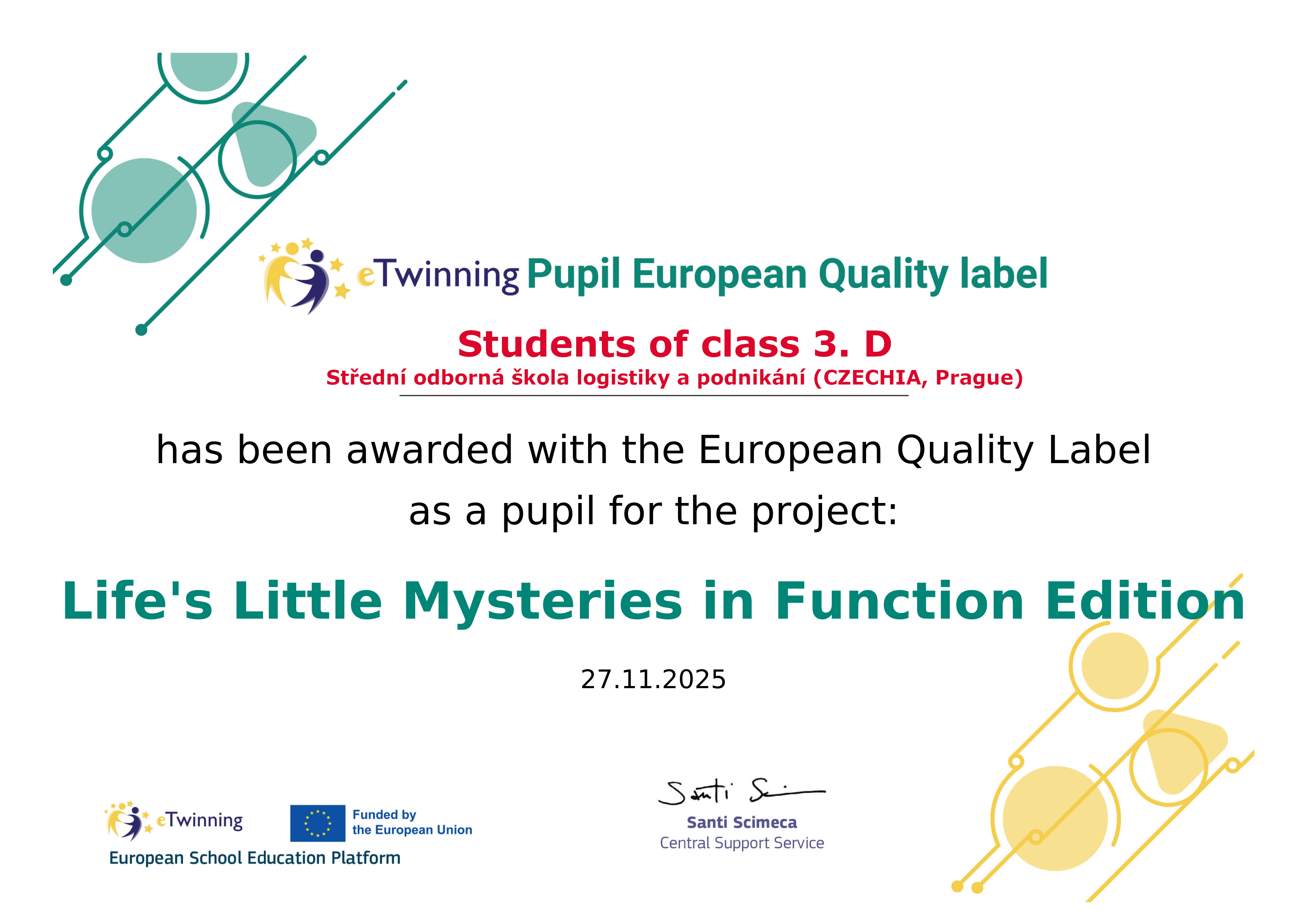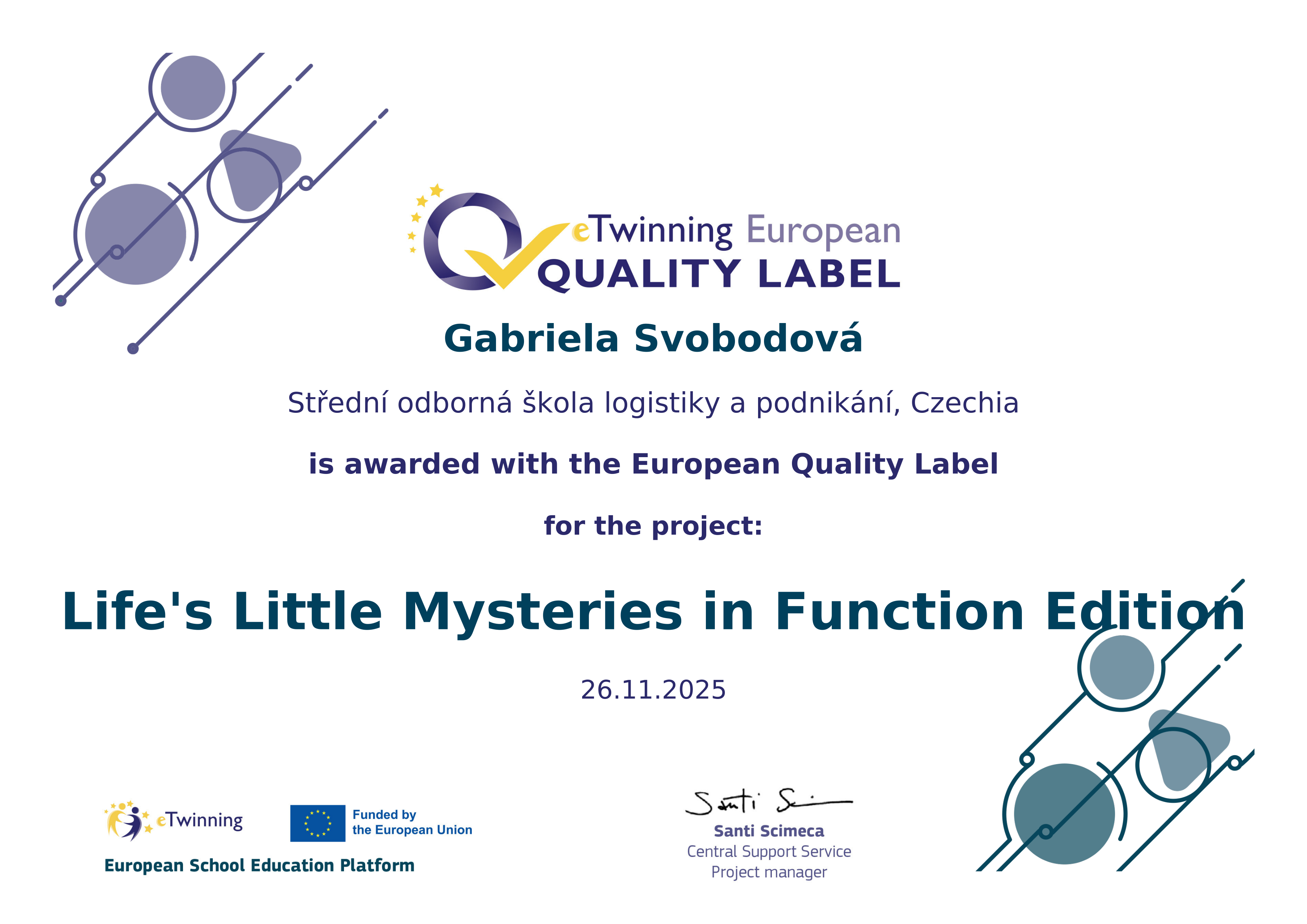 Máme obrovskou radost, že náš eTwinning projekt Life's Little Mysteries in Function Edition získal v tomto roce ocenění Evropský certifikát kvality (European Quality Label - EQL).